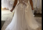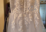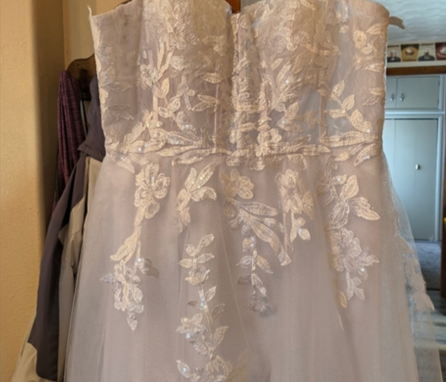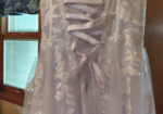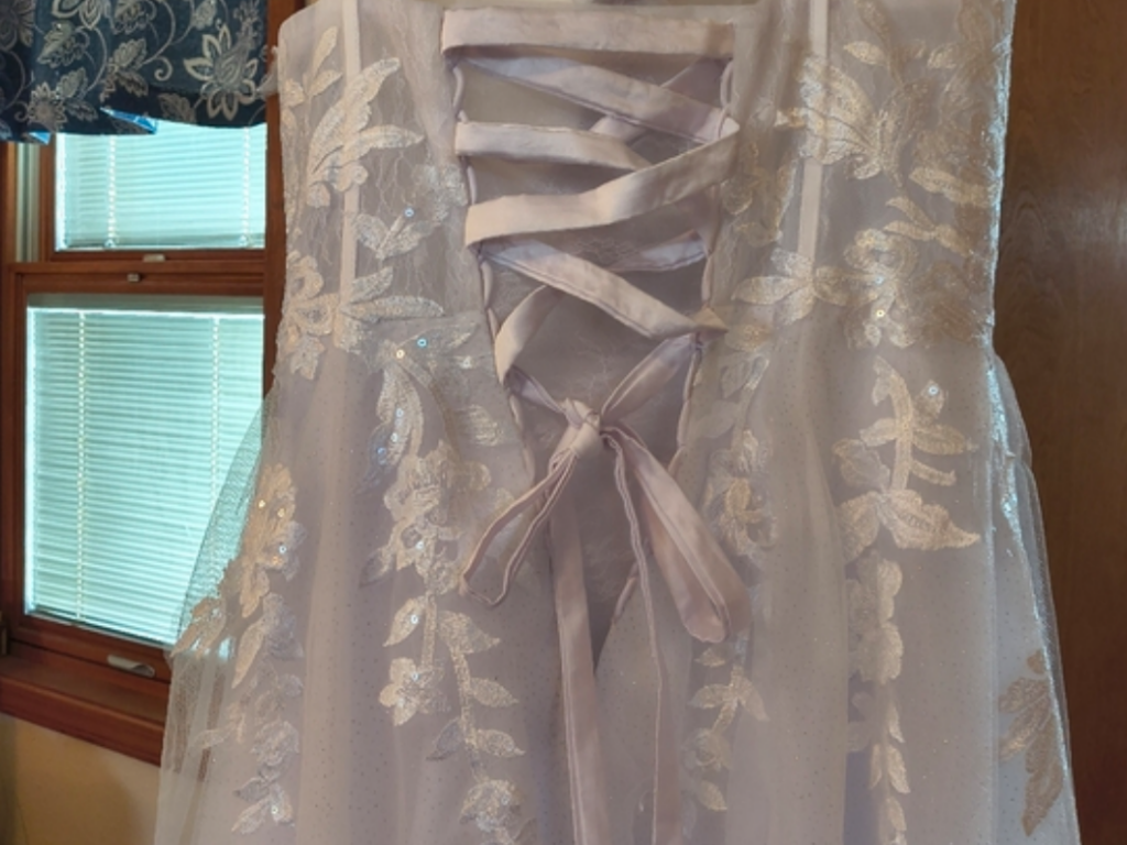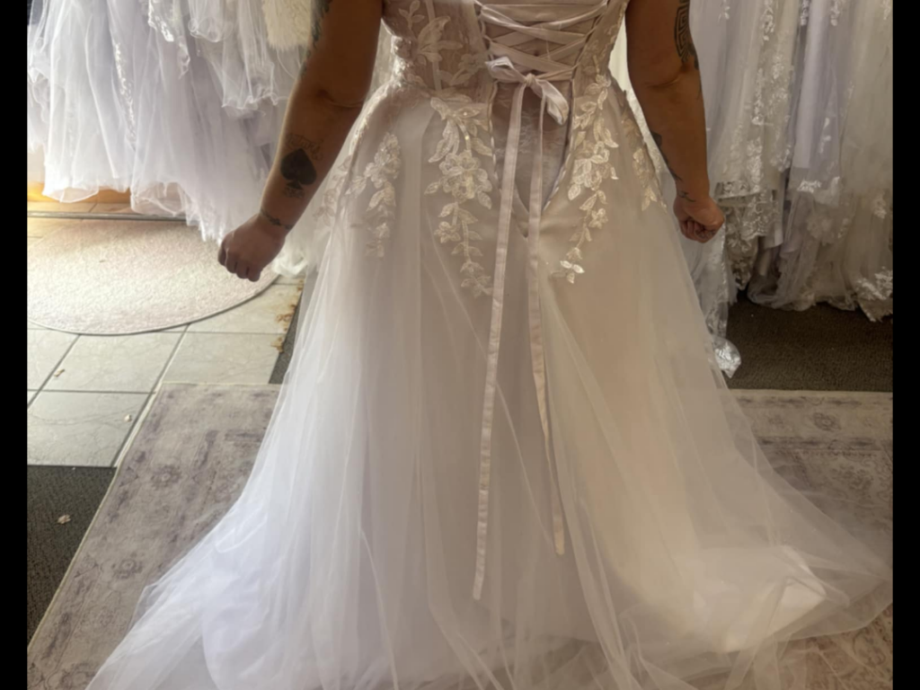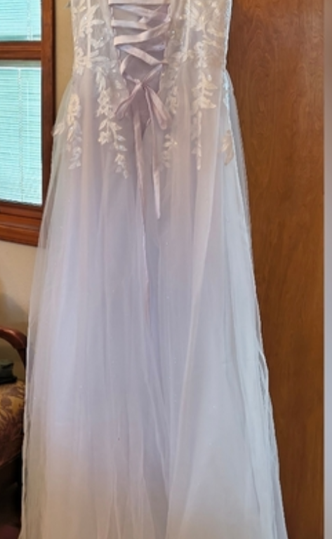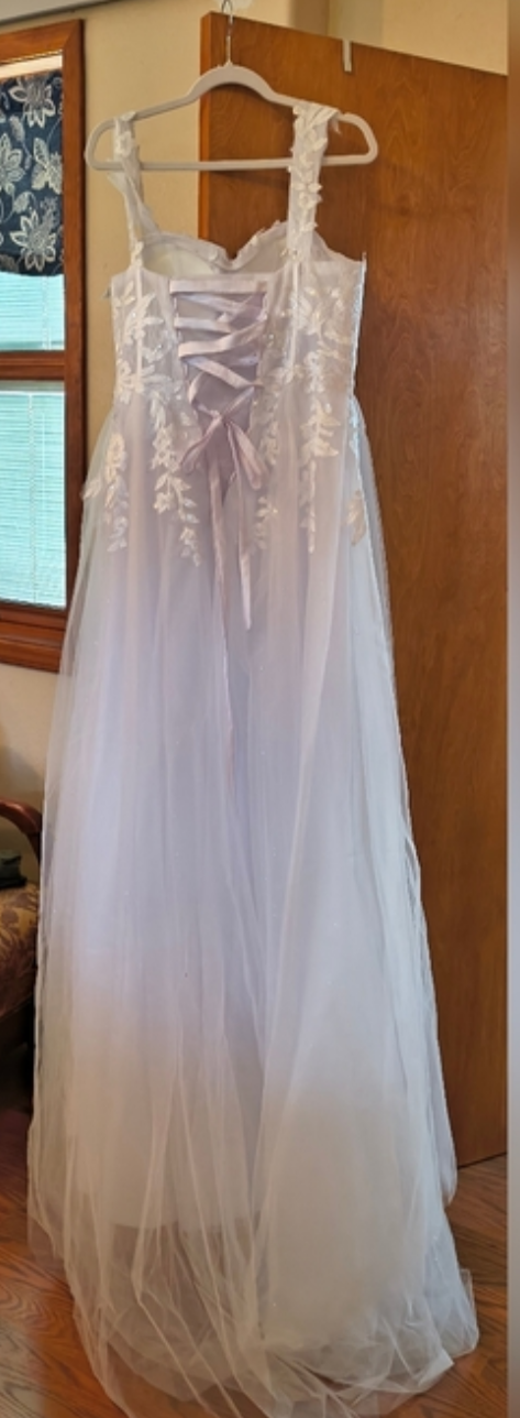 With the corset back this dress will accommodate sizes 10 all the way up to 14.