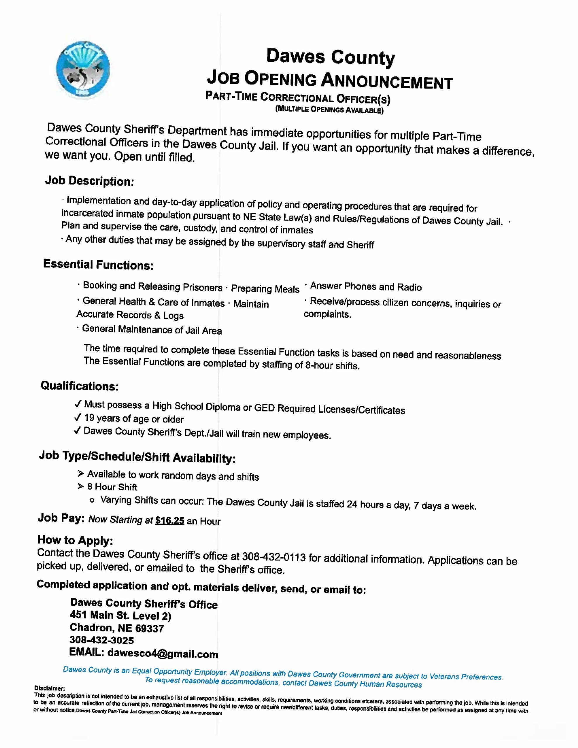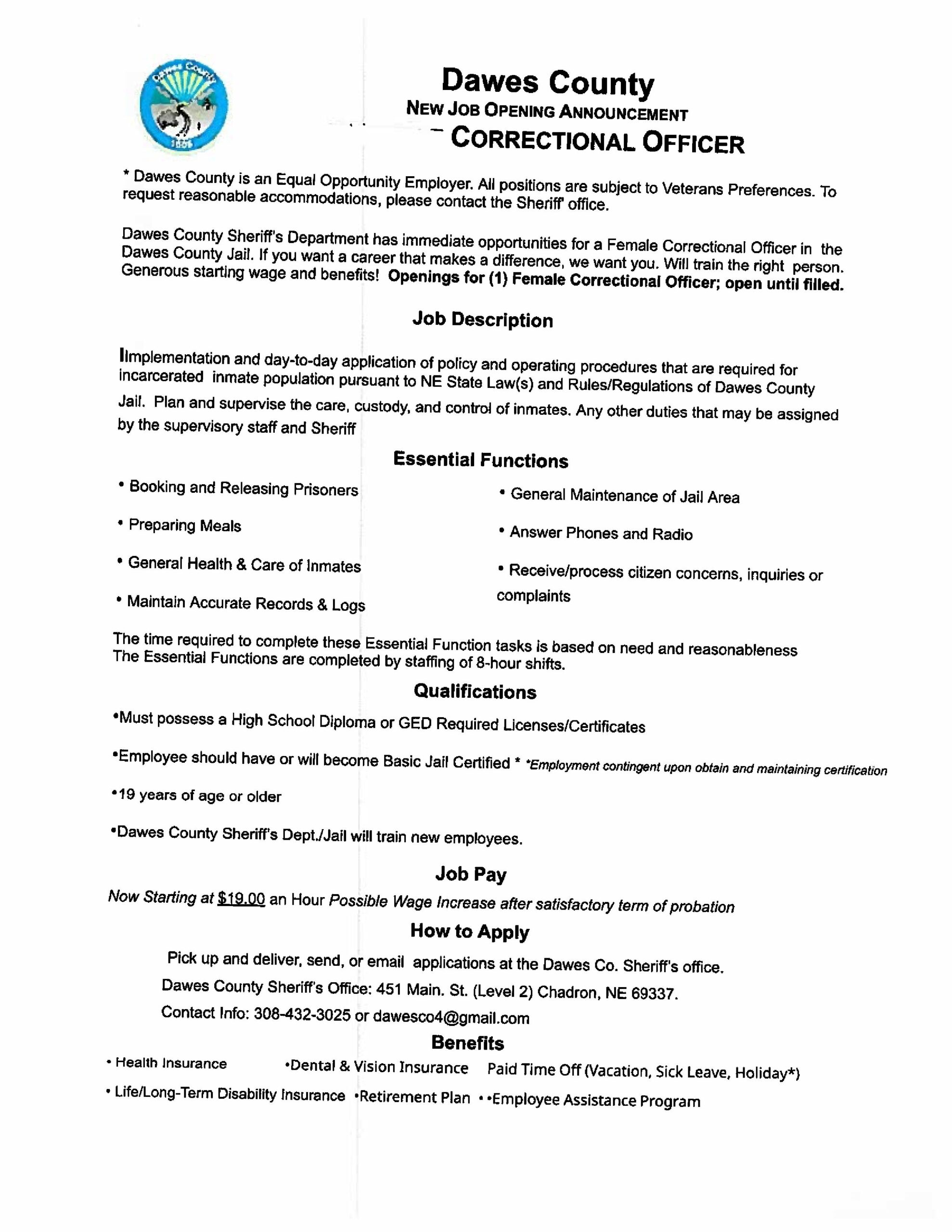 Dawes County Correctional Officer Published 04/21/2026 - 7 days ago Category Job Listings Description Show Contact Info Send Message Your Name * Your Email * Subject * Message * Website Address Send Message